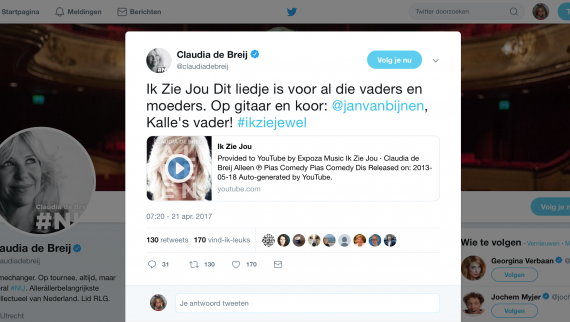 Tijdens de #IKZIEJEWEL actie hebben ook veel BN-ers meegedaan. Zo heeft Claudia de Breij in een twitterbericht dit lied opgedragen aan alle vaders en moeders van een ZEVMB kind.